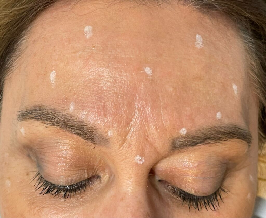 Se marcan con precisión los puntos específicos donde se aplicarán los neuromoduladores, según el diagnóstico y la anatomía facial de la paciente.